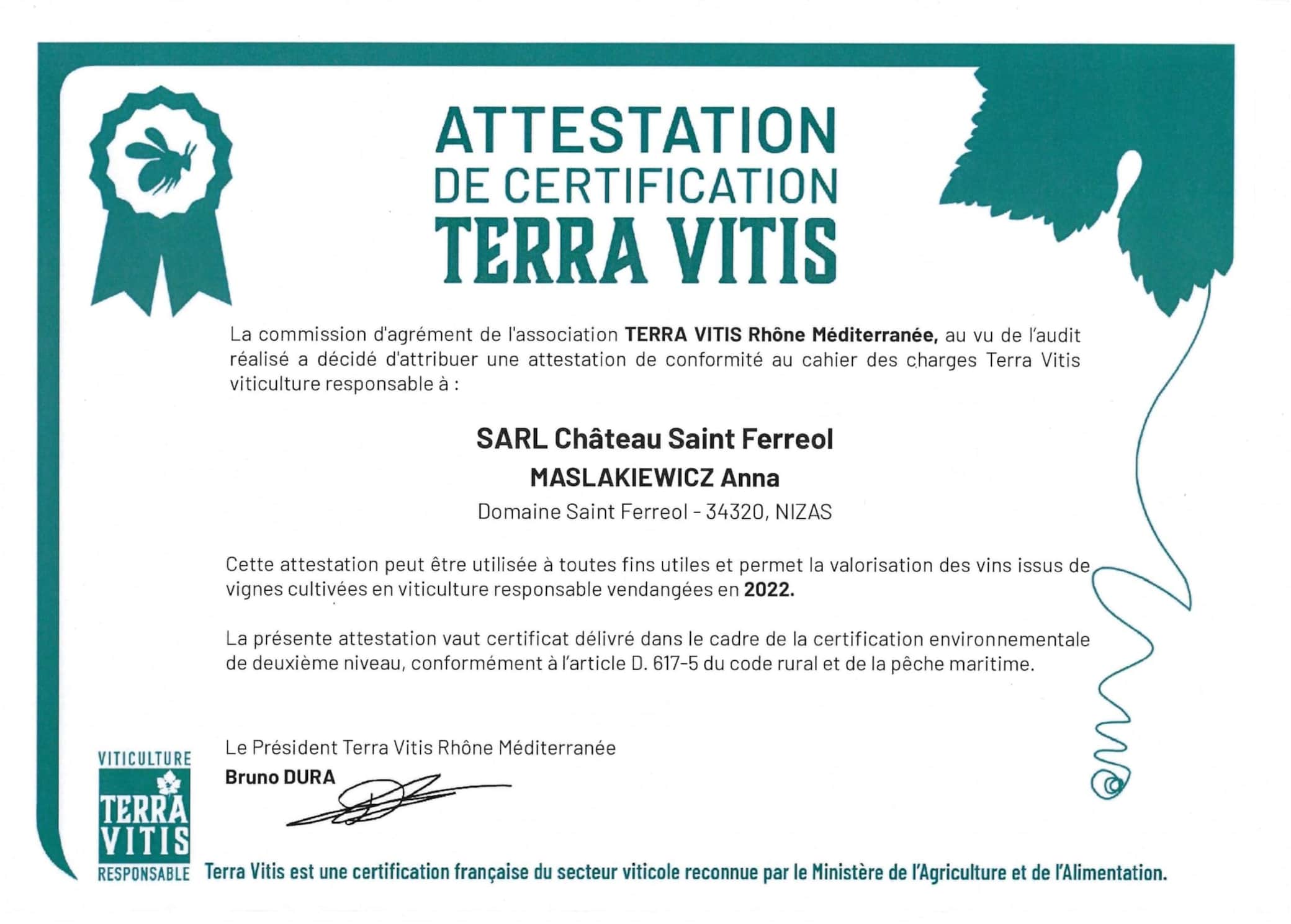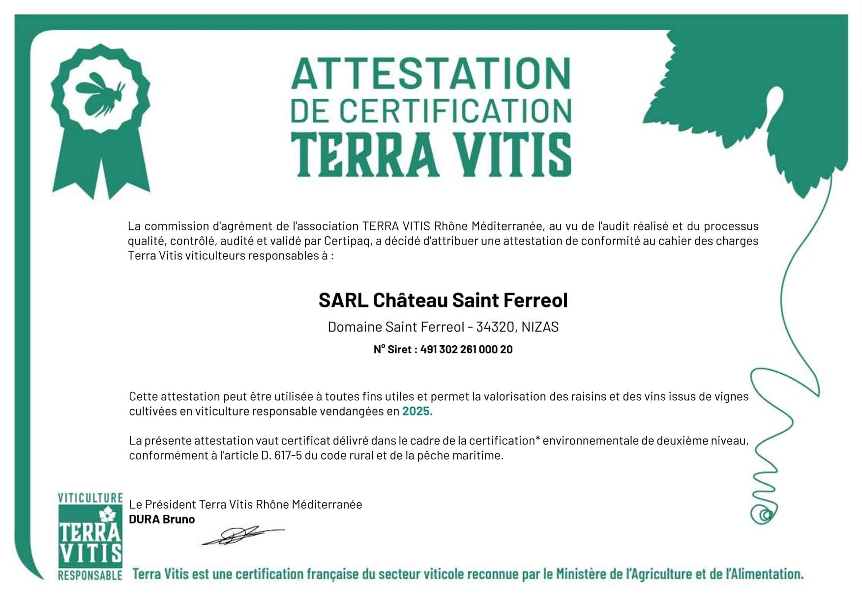 Our aim in breathing new life into the vineyard was to set up a sustainable, ecological and economical agriculture, whilst reducing all environmental impact of agricultural activity on soil, air and water quality. Hence our subscription to Terra Vitis , a certification standard of sustainable viticulture in collaboration with the Chamber of Agriculture. From planning and planting vines to the final wine in bottle we respect all the rules set out in the Terra Vitis charter. Transparency in everything we do in the vines and the cellar. As a Terra Vitis certified domaine we are automatically awarded level 2 of High Environmental Value